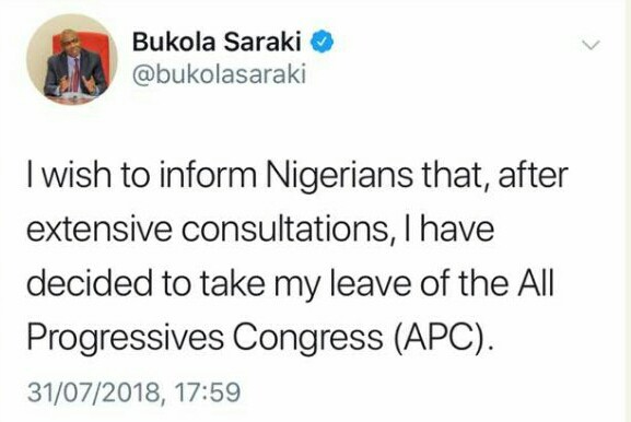 the ruling All Progressives Congress, APC. He confirmed his exit from