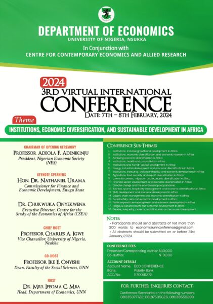 Academics, researchers, civil society organizations, practitioners and postgraduate students are now invited to submit policy-relevant abstracts for inclusion in any of the sub-themes of the 3rd International Virtual Conference of the Department of Economics, University of Nigeria, Nsukka.