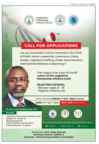 Deadline: October 14, 2025 The LMI Fellowship Programme is designed to equip and empower dynamic young Nigerians with the skills, knowledge, and practical exposure needed to excel in public sector leadership, particularly within the legislature.